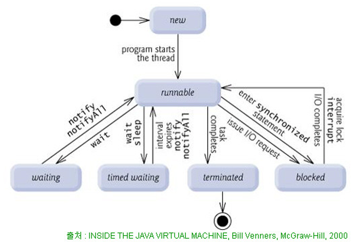 4) timed waiting, waiting : 실행가능하지 않은 (unrunnable) 일시 정지 상태